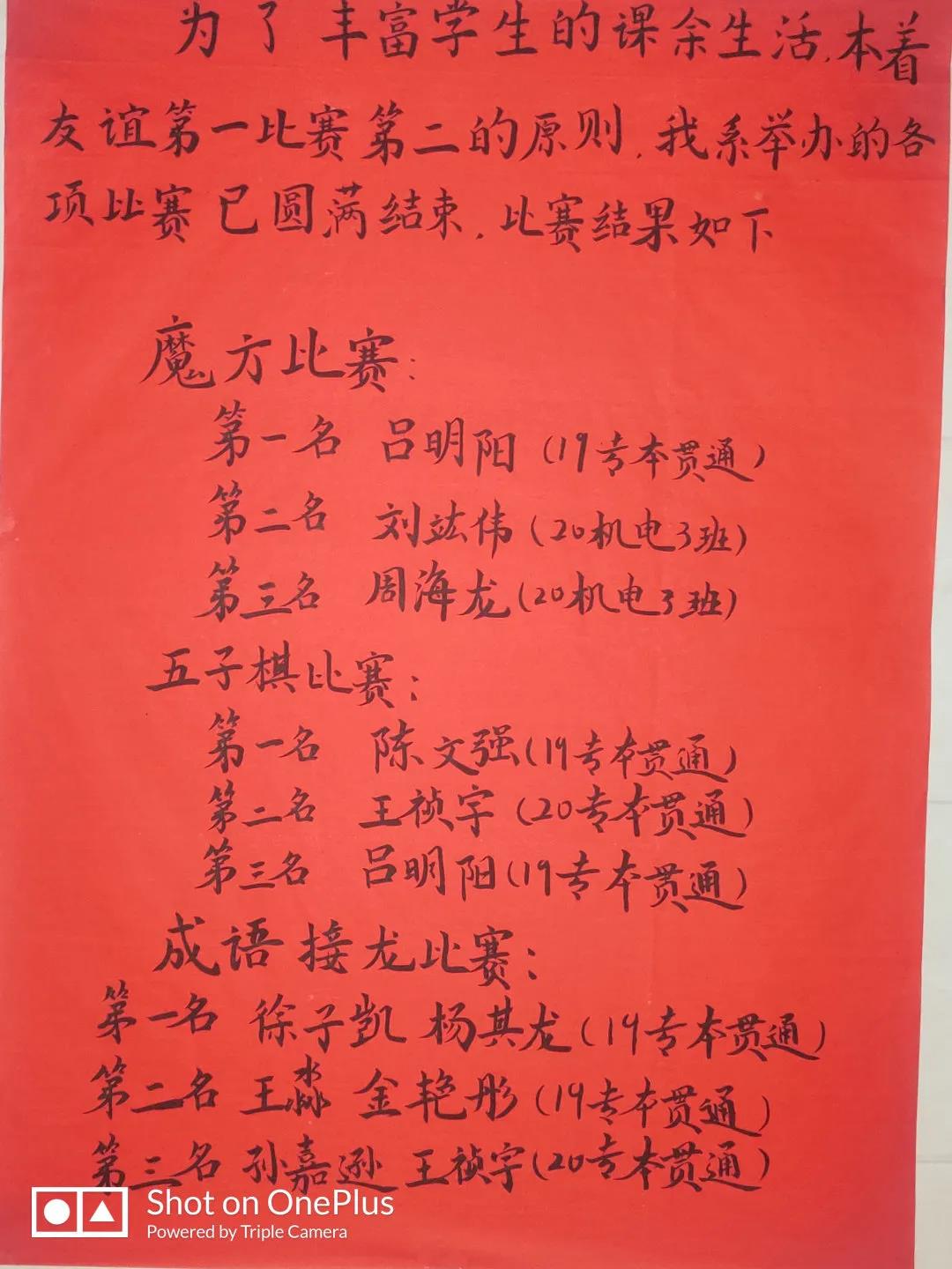 为了丰富和活跃校园生活,提高我院学生身心素质,推进我院社会主义精神文明建设,增强同学的竞争意识。在过去的一周内,机电与汽车工程学院文宣部分别举办了魔方、五子棋、成语接龙趣味比赛活动。