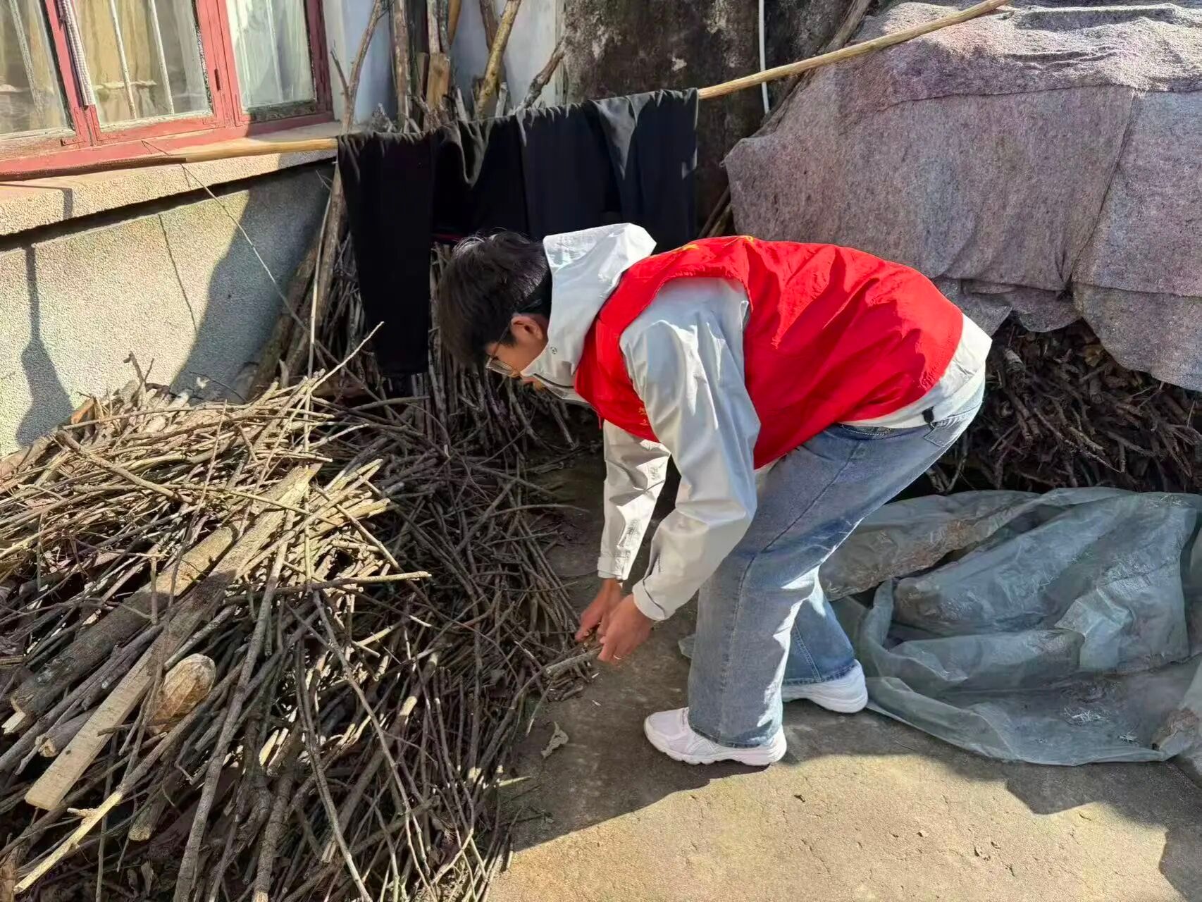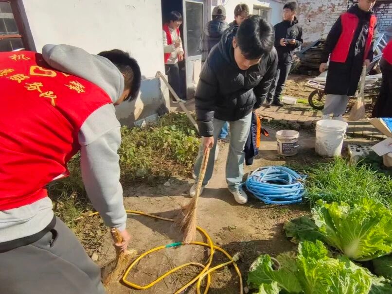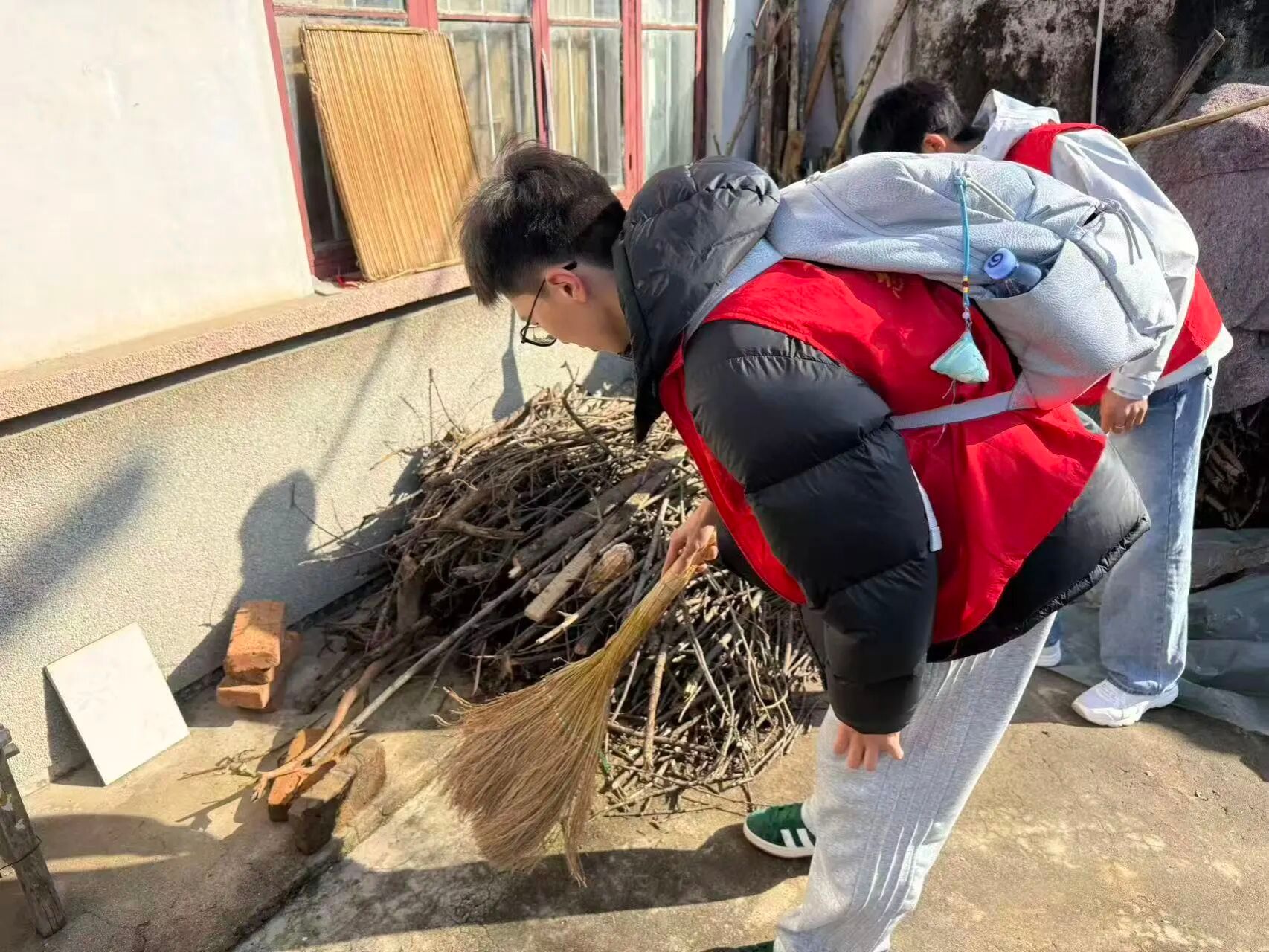 随后,大家拿起清洁工具帮老人清理院内落叶、杂草与杂物:有的蹲扫角落碎石,有的踮脚擦窗台灰尘,有的打包清运垃圾,分工明确、干劲十足。