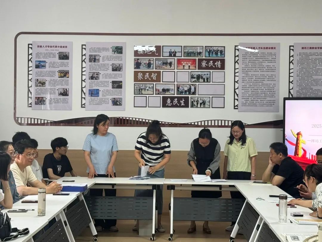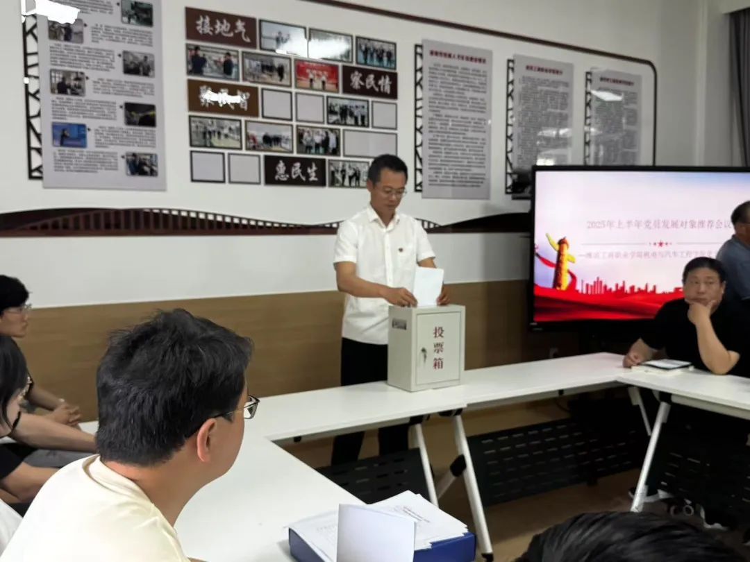 2025年5月21日上午,潍坊工商职业学院机电与汽车工程学院在车间A座进行2025年上半年发展对象推荐会议。潍坊工商职业学院党建办主任李冰主任、机电与汽车工程学院党支部全体党员教师以及群众代表参加会议,共同为党组织注入新鲜血液、选拔优秀人才。