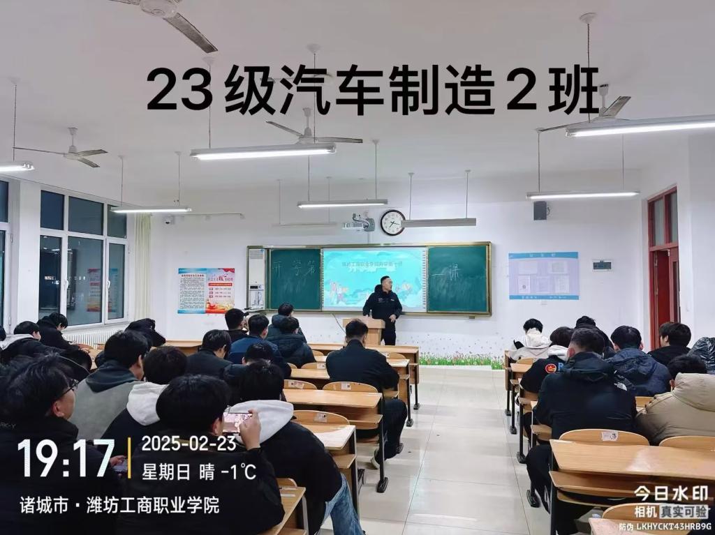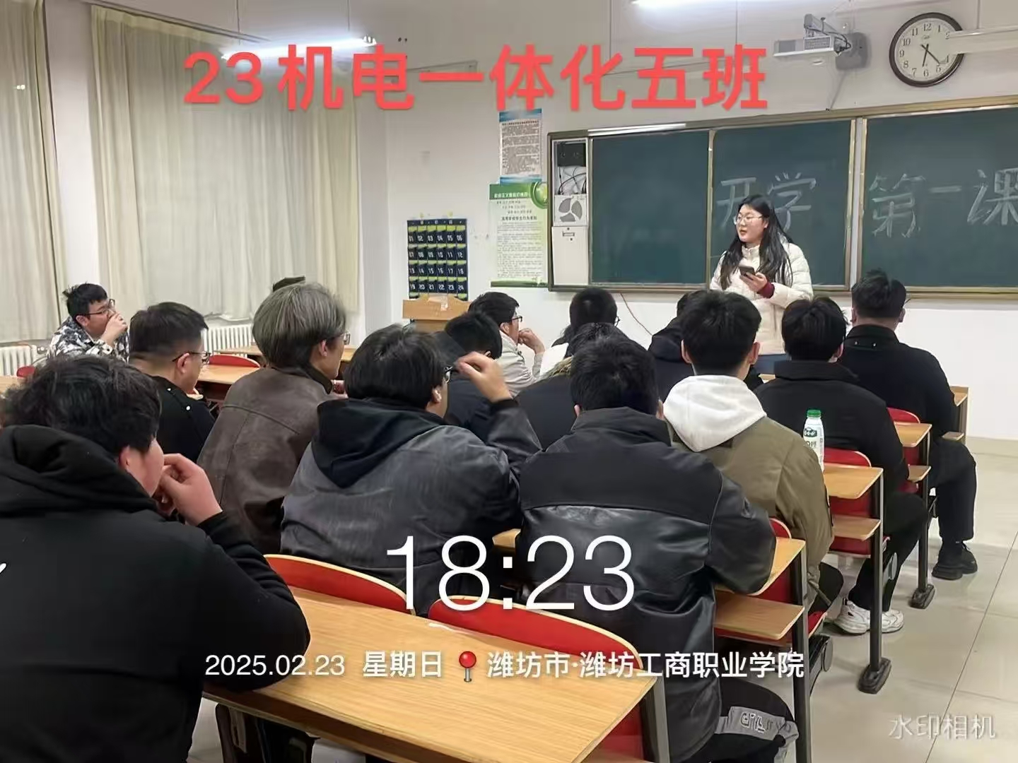 新学期,新气象,潍坊工商职业学院机电与汽车工程学院为进一步加强学生思想道德教育,保障学生身心健康,有效落实学校安全、德育、教学工作,提高同学们的自我防护能力,确保学生健康茁壮成长,共建平安和谐校园,学院各个班级于2025年2月23日组织开展“开学第一课”主题班会活动。