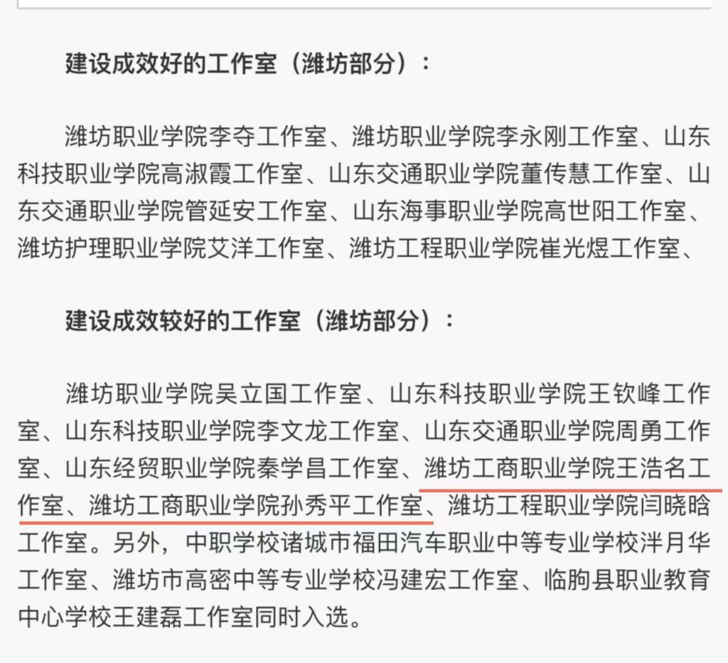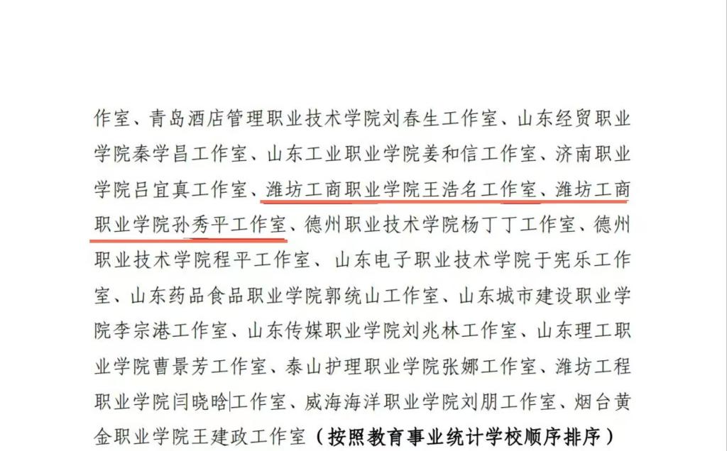 12月4日,山东省教育厅发布《关于首批山东省职业教育技能大师工作室2024 年度建设情况的通报》,对首批150个山东省职业教育“技能大师”工作室2024年度建设情况进行了梳理。潍坊工商职业学院王浩名工作室、潍坊工商职业学院孙秀平工作室,获得了建设成效较好的工作室,获得山东省教育厅点赞。