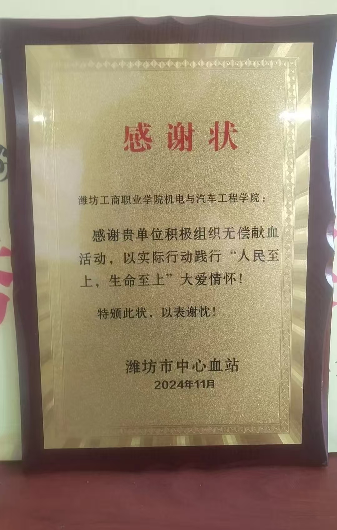 涓涓热血,铺就生命之路;拳拳爱心,传递人间真情。潍坊市中心血站感谢:机电与汽车工程学院全体献血志愿者积极参加无偿献血活动,以实际行动践行“人民至上,生命至上”,续写生命的华章,为建设文明和谐社会注入正能量。