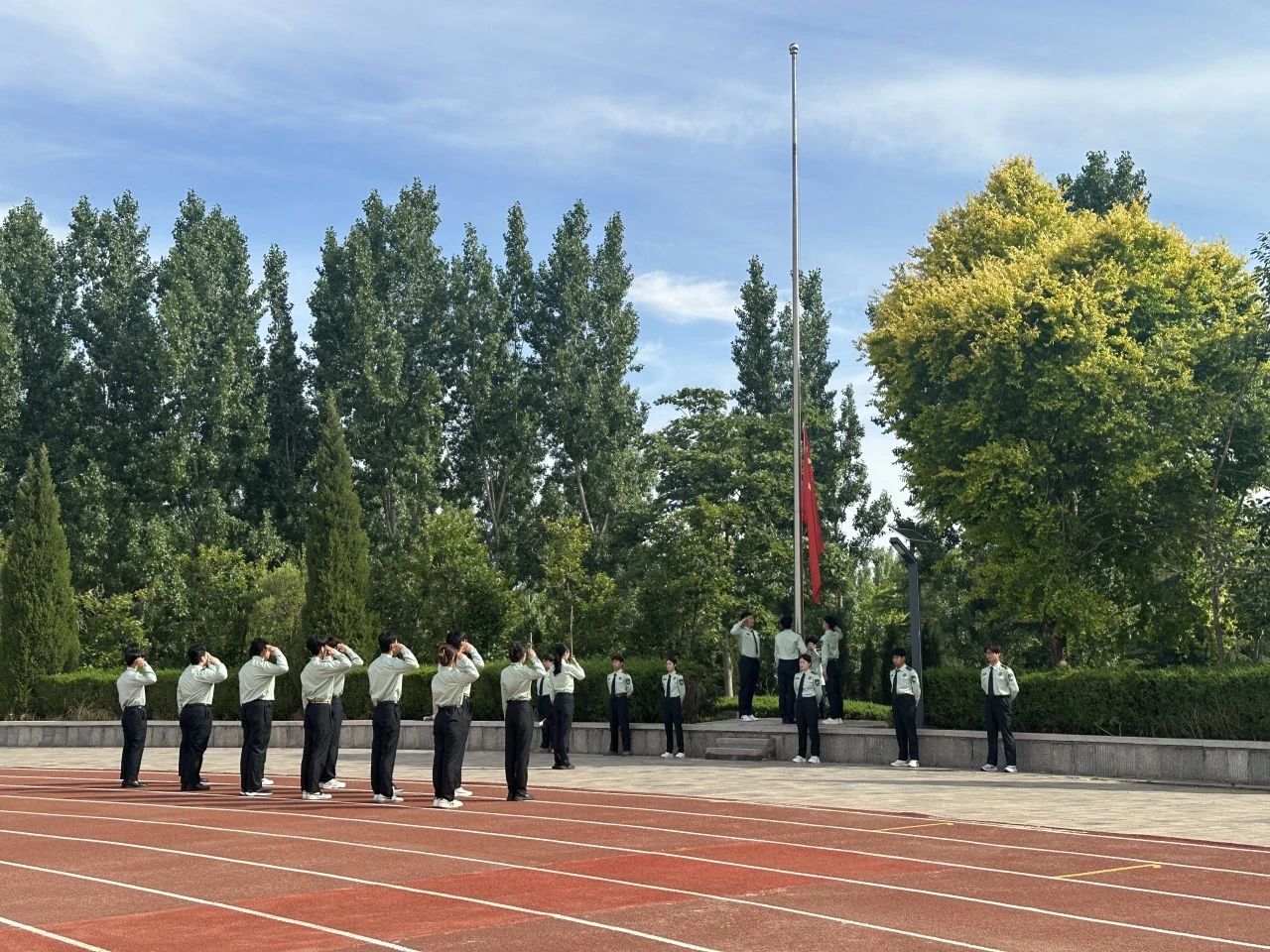 在激昂的音乐声中,国旗护卫队护送国旗出场。观礼师生全体肃立。在雄壮的国歌声中,国旗冉冉升起,全体师生行注目礼。