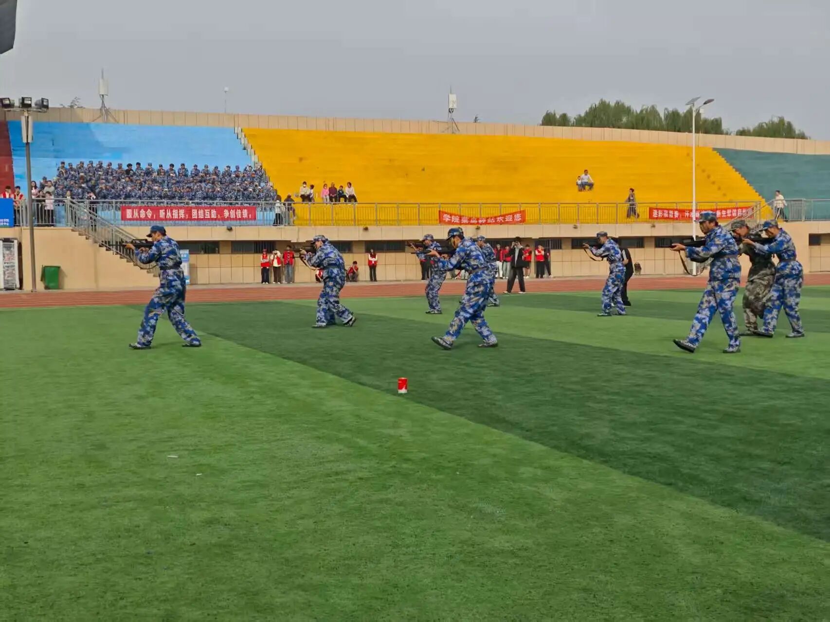 分列式、擒敌拳、捕俘刀、格斗术及战术情景模拟推演等会操环节精彩纷呈。彰显了军训的丰硕成果,现场掌声不断。