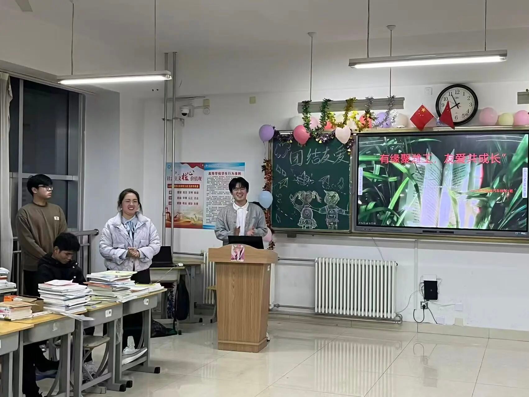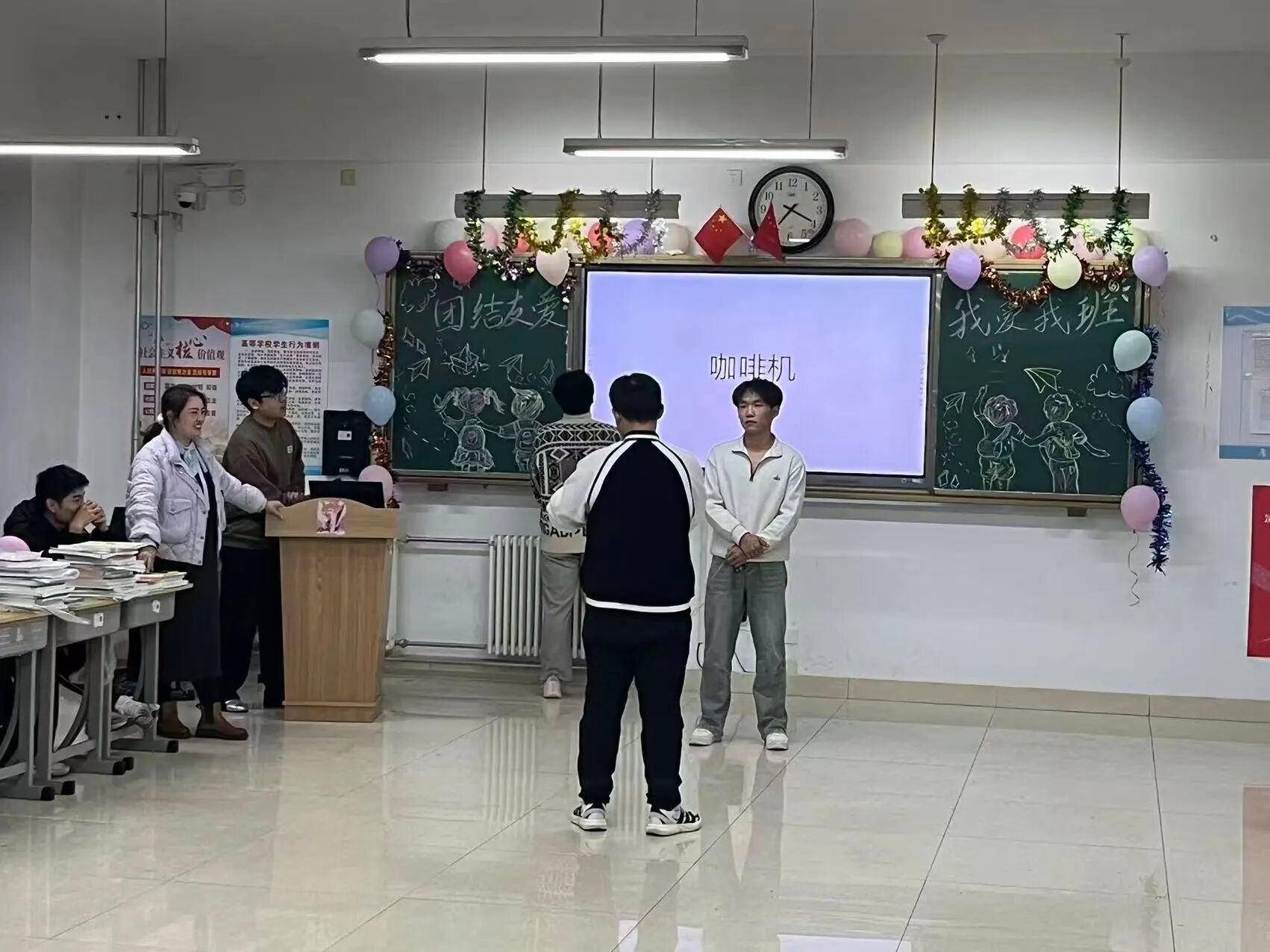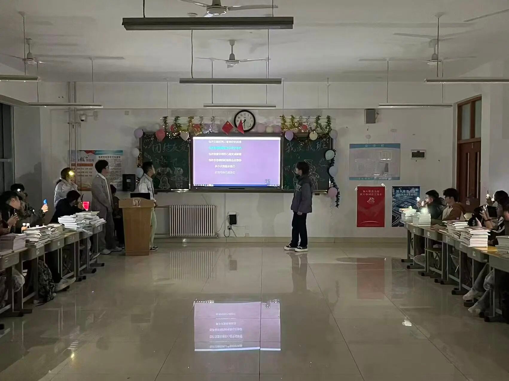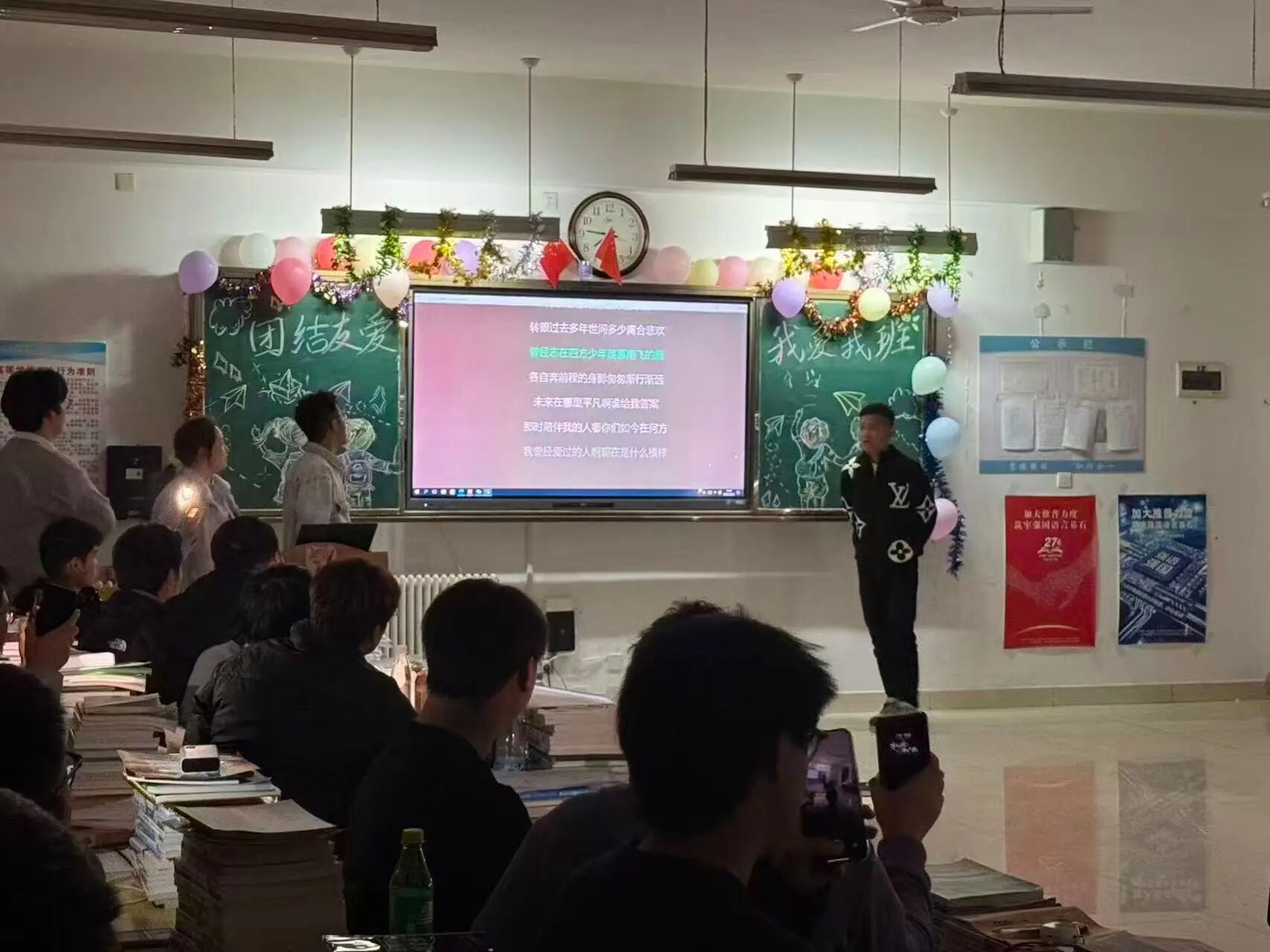 最后,全班进行大合唱,同学们齐声歌唱,用歌声传递情感,在旋律中进一步凝聚了班级的向心力,让班级更像一个温暖的大家庭。