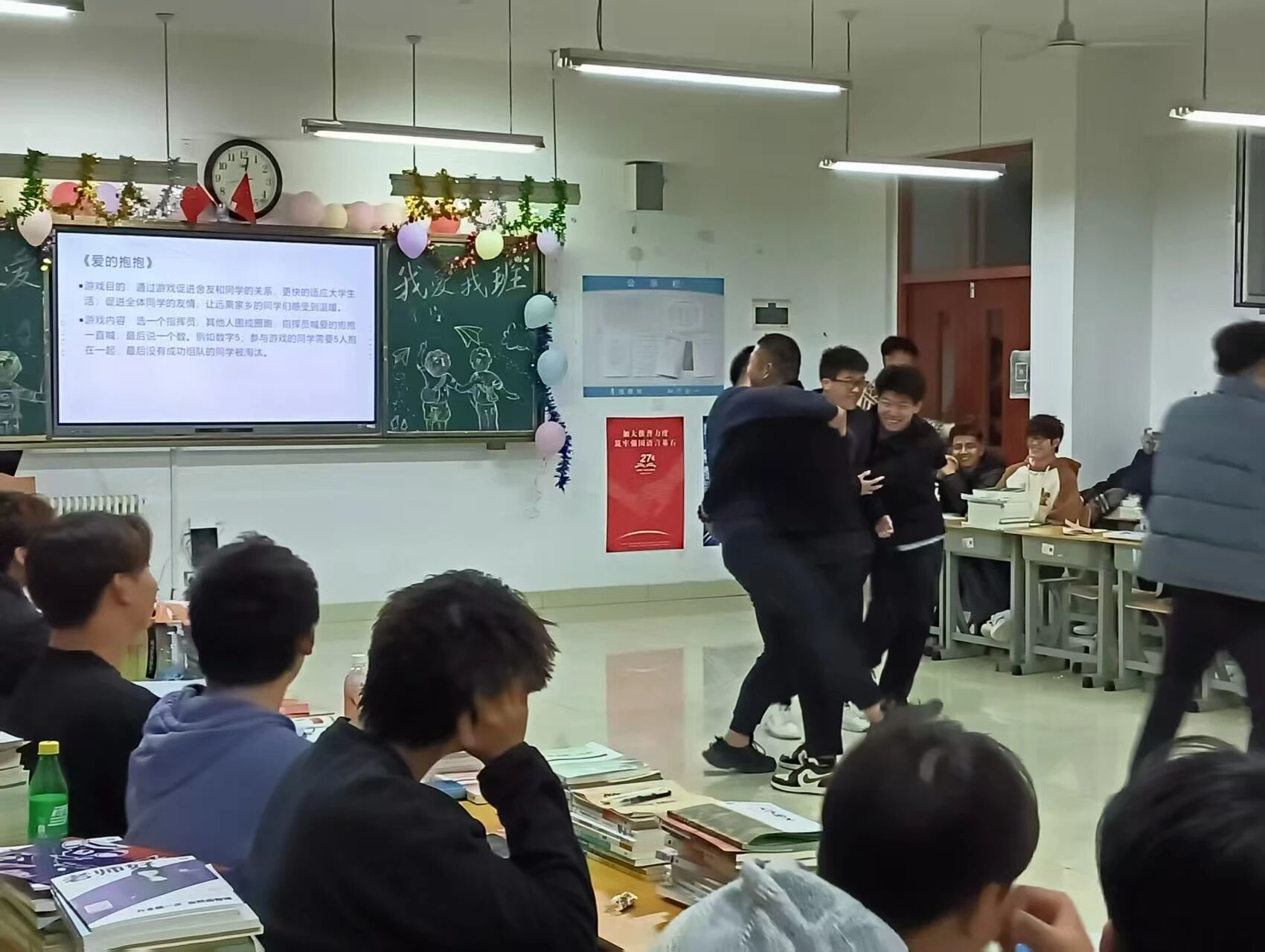 爱的抱抱”里,指挥员喊出数字,同学们迅速组队拥抱,没成功组队的同学被淘汰。这个游戏促进了舍友与同学间的关系,让远离家乡的同学感受到温暖,助力大家更快适应大学生活。