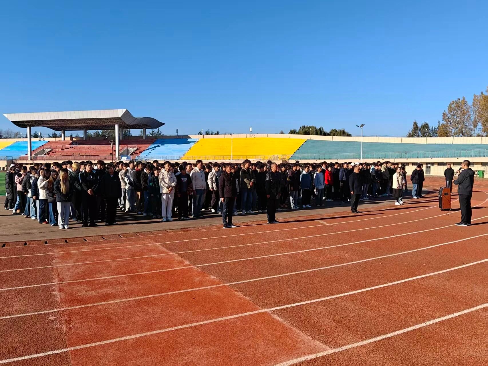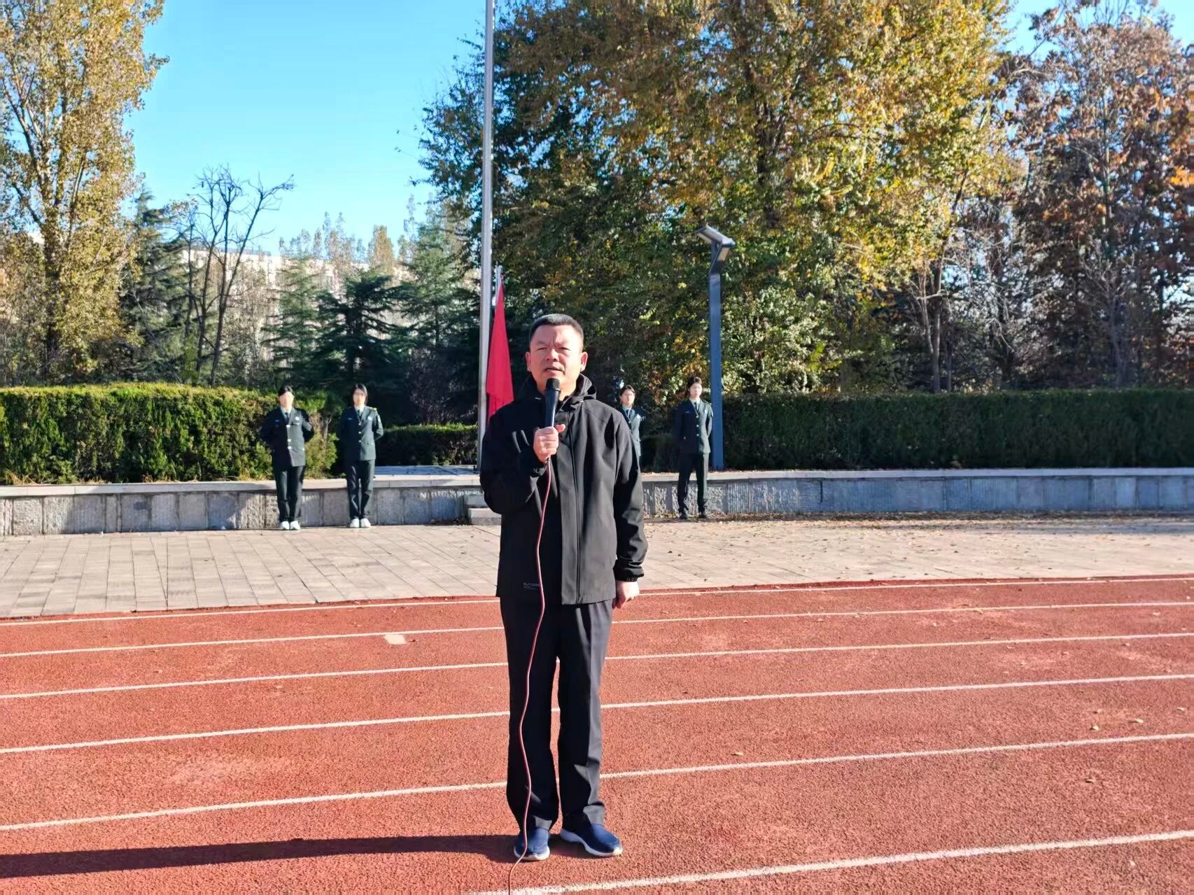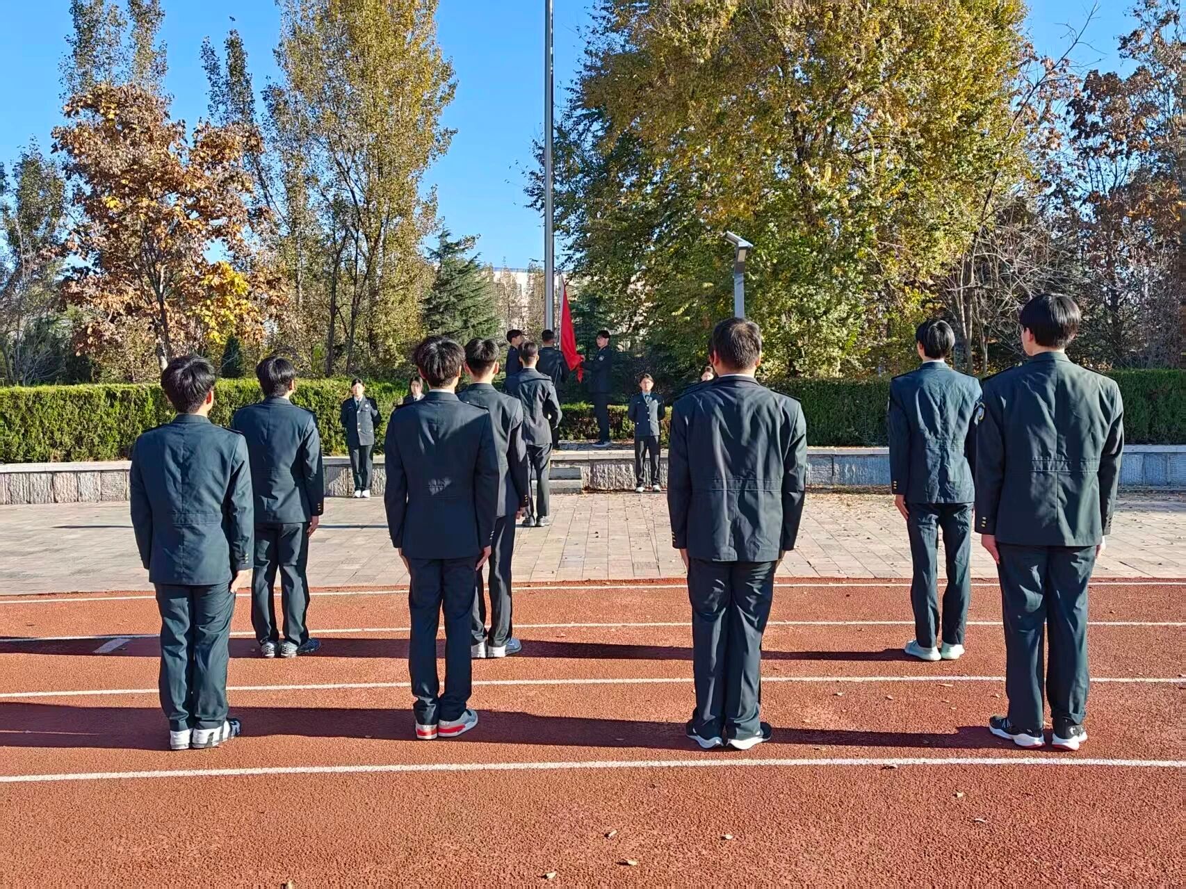 2025年11月10日清晨,晨曦初照校园,机电与汽车工程学院、航空产业学院的全体师生齐聚操场北国旗杆下,静候8点整升国旗仪式的正式开始。