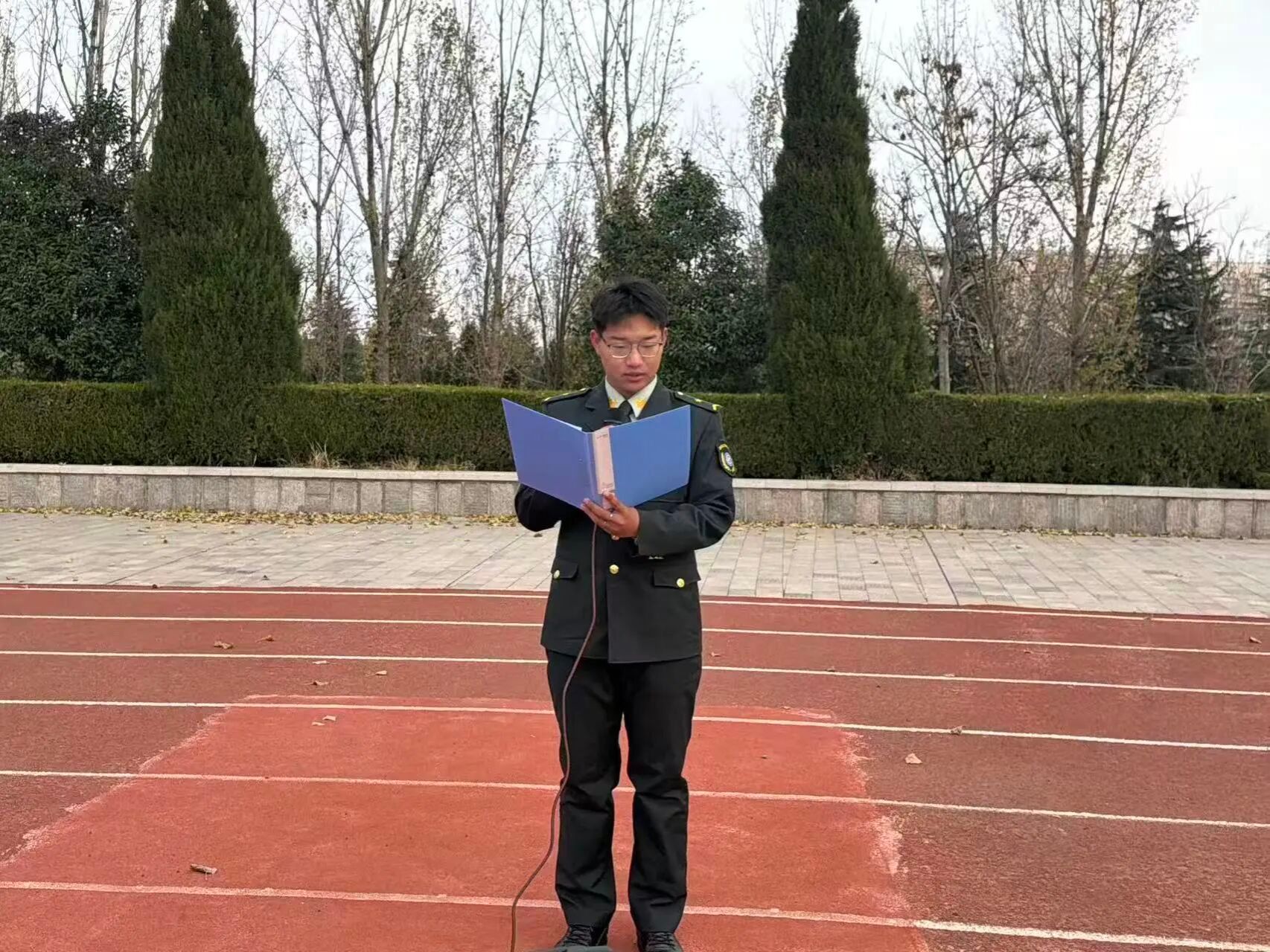 第三项,由24级国旗护卫队队长,民航安全技术管理班班长王硕同学演讲。他讲到我们敬畏国旗、感恩新老队员的付出,愿新队员牢记使命、捍卫国旗尊严,祝愿国旗护卫队越来越好。