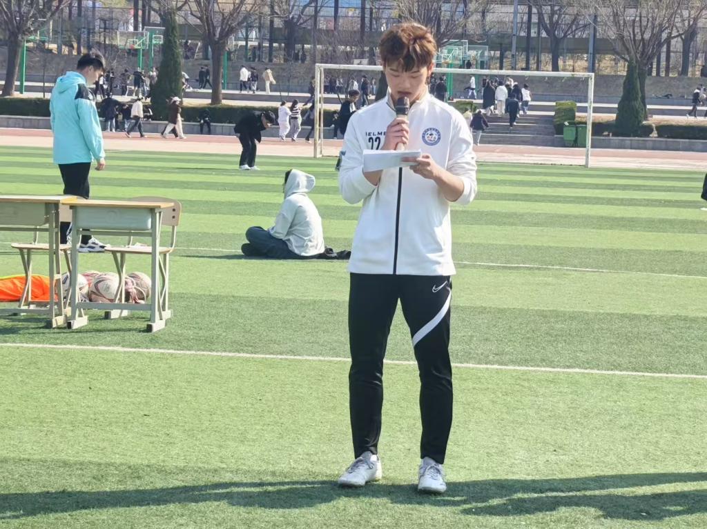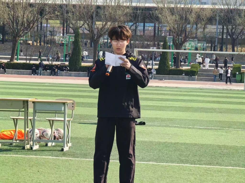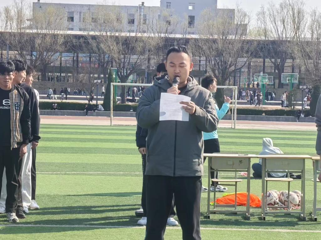 紧接着,我院臧福运老师发言:足球,是一项充满激情与活力的运动,它承载着团结、拼搏、进取的精神。在赛场上,每一次的传球、射门,都是团队协作的体现;每一次的奋力奔跑、积极防守,都彰显着永不言弃的斗志。对于我们机电的同学们来说,这不仅是一场体育赛事,更是增进彼此友谊、凝聚班级力量的绝佳机会。希望大家能秉持着“友谊第一,比赛第二”的原则,尽情地在绿茵场上挥洒汗水,赛出风格,赛出水平。