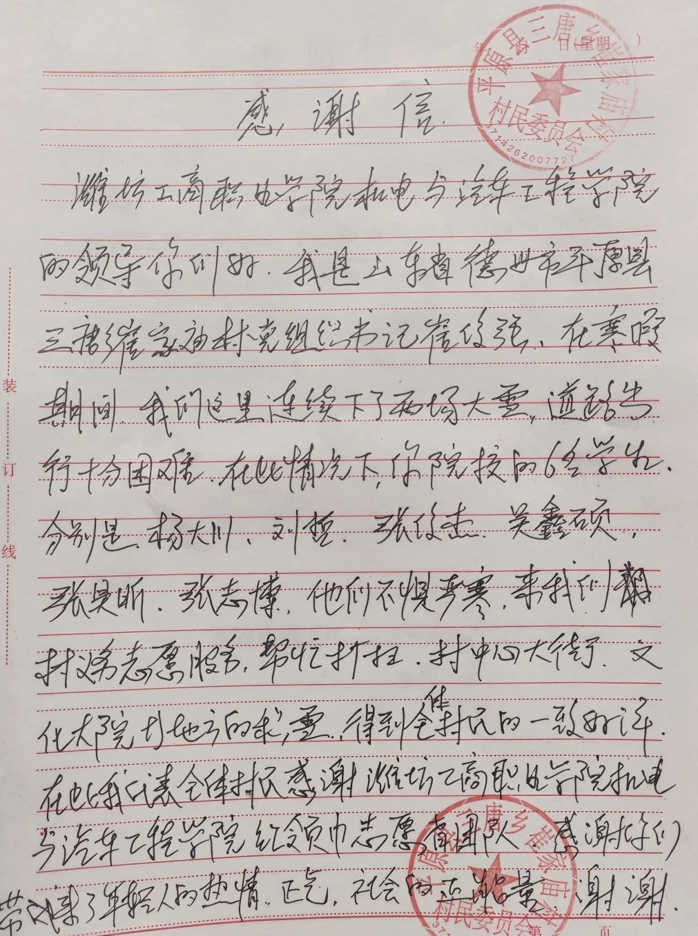 2024年1月19日日杨大川,刘哲,吴鑫硕,张昊昕,张志博,张俊杰,他们不惧寒冷,在一月大雪的时候道路出行十分困难的情况下,去到乡村参加志愿活动,帮助老人打扫卫生清扫路面积雪得到了村民的一致好评,特此平原县三塘乡崔家庙村村民居委会送来感谢信以此感谢红领巾志愿者团队