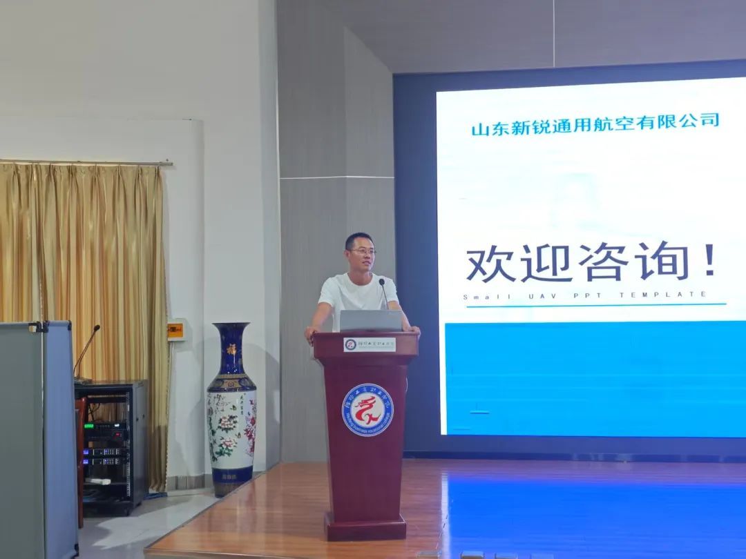 报告会上,来自山东新锐通用航空有限公司的无人机副总经理郭明围绕无人机驾驶行业展开了全面而深入的讲解。从无人机的发展历程和现状出发,阐述了无人机从早期简单的军事应用逐渐拓展到如今民用领域的广泛应用,如影视航拍、农林植保、电路巡检、遥感测绘、应急救灾等。