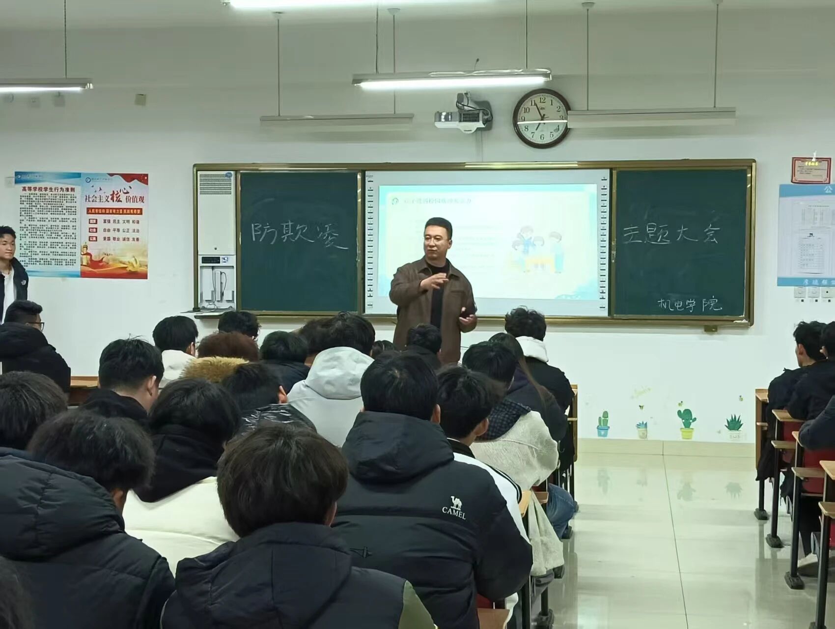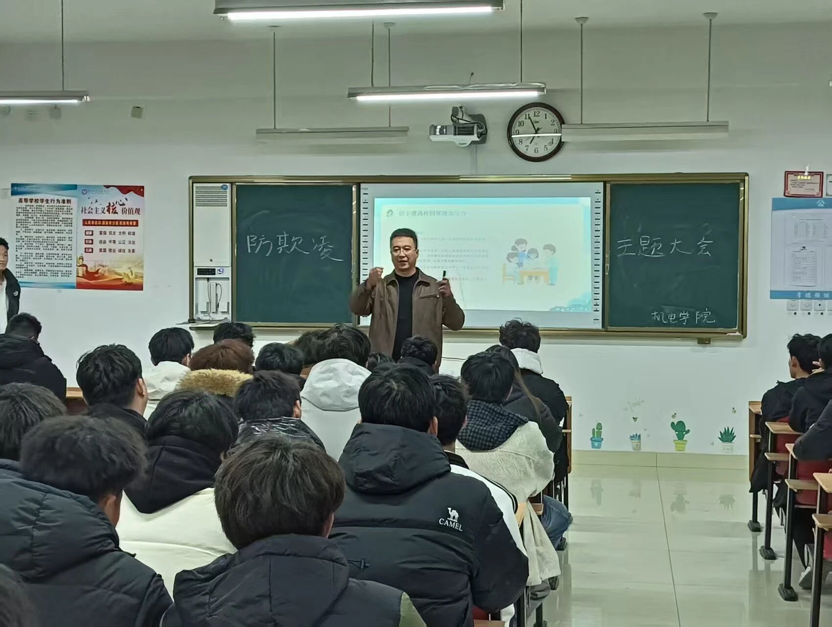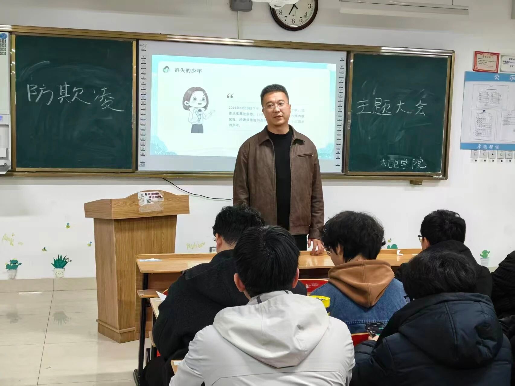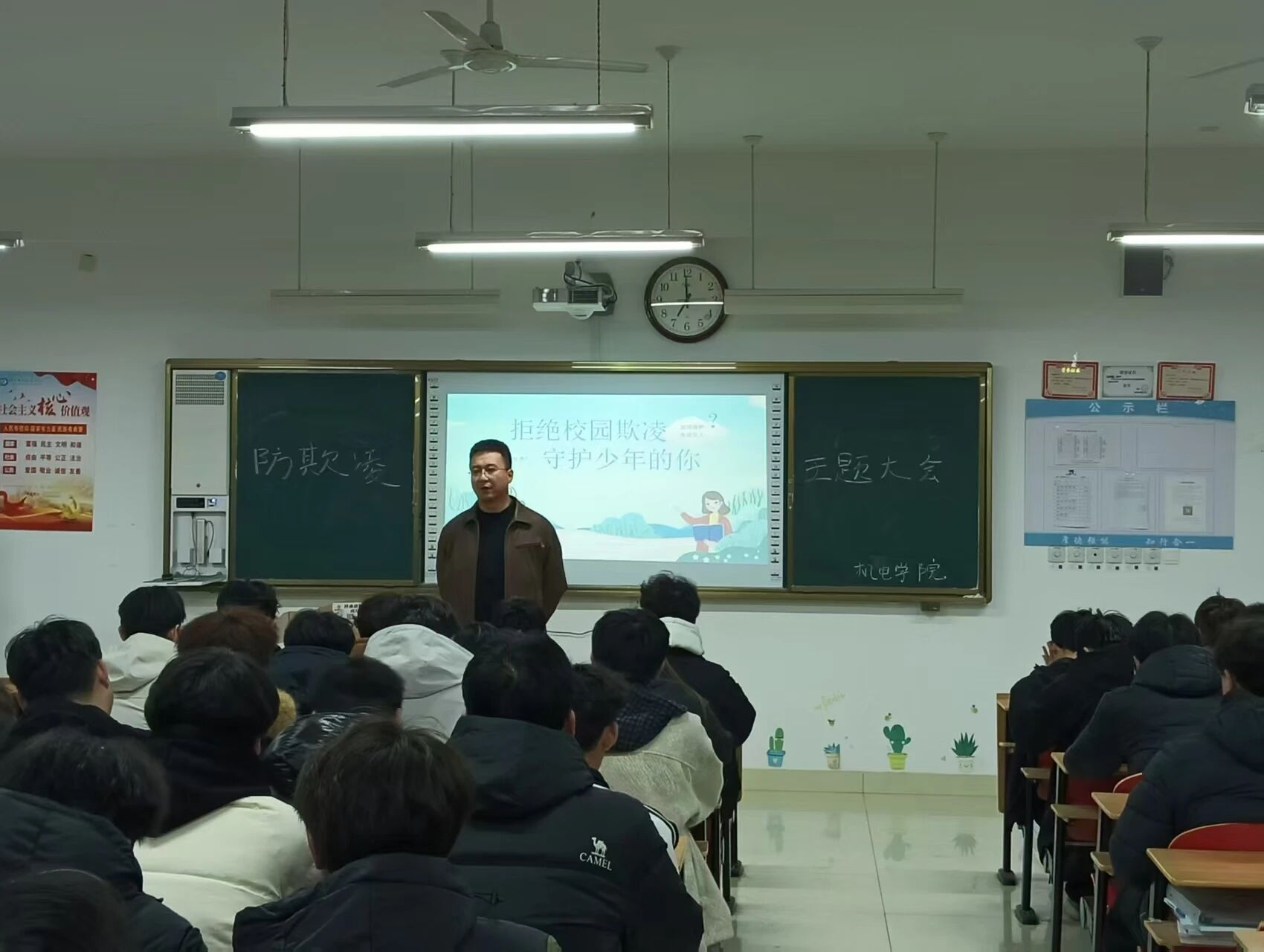 2026 年 3 月 17 日晚 18 点 45 分,机电与汽车工程学院在尚文楼 421 召开校园防欺凌主题大会,由徐砚全书记主持,旨在强化学生法治与安全意识,预防校园欺凌。